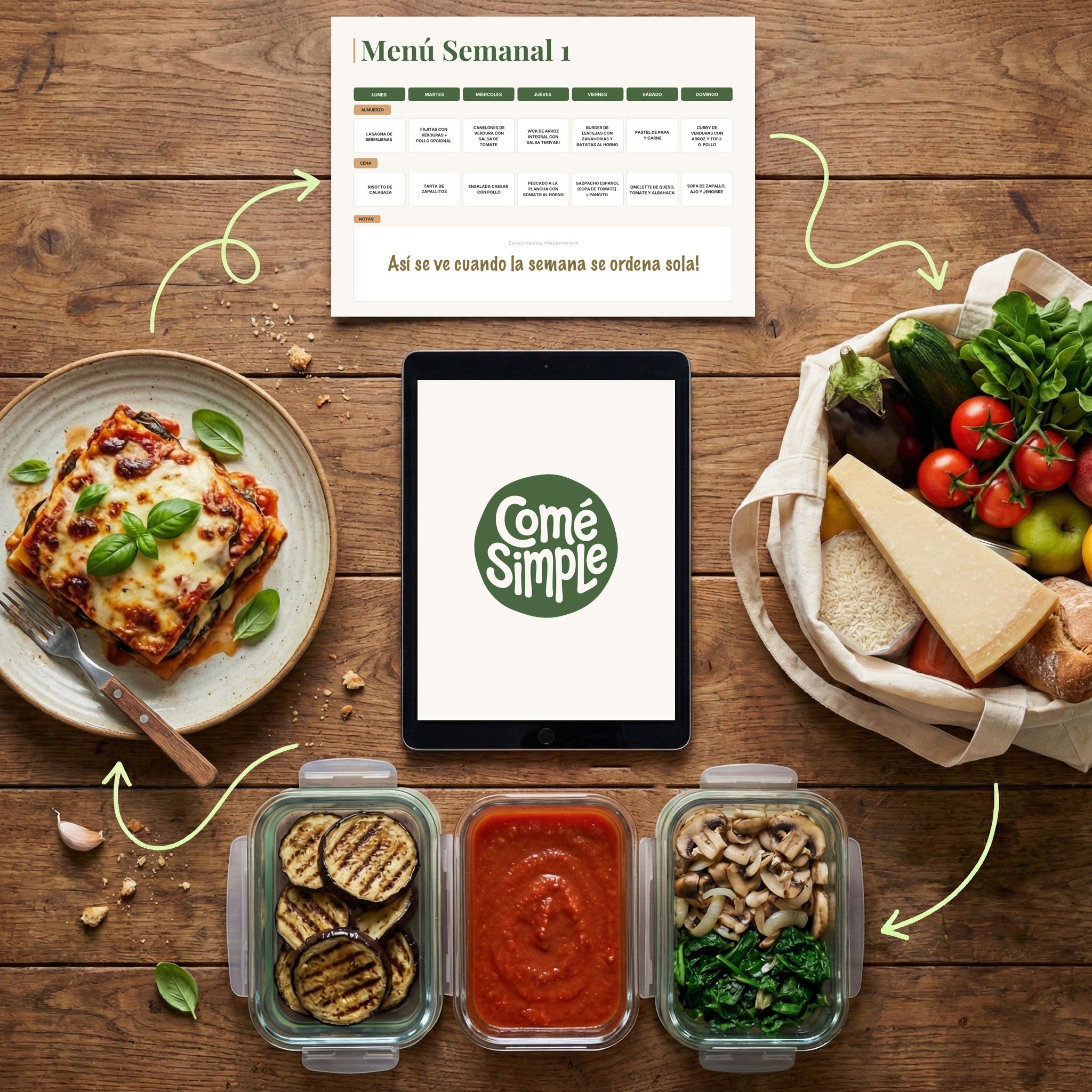 Comé Simple no es solo un recetario. Es una forma simple de organizar la comida sin pensar todos los días, diseñada para sacarte decisiones de encima y devolverte orden, tiempo y tranquilidad.